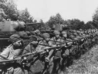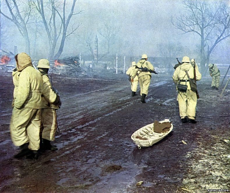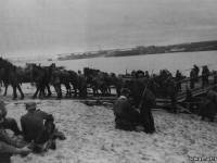 Немецкие солдаты и обоз с припасами на переправе через реку по пути на фронт. СССР, октябрь 1941 года.
